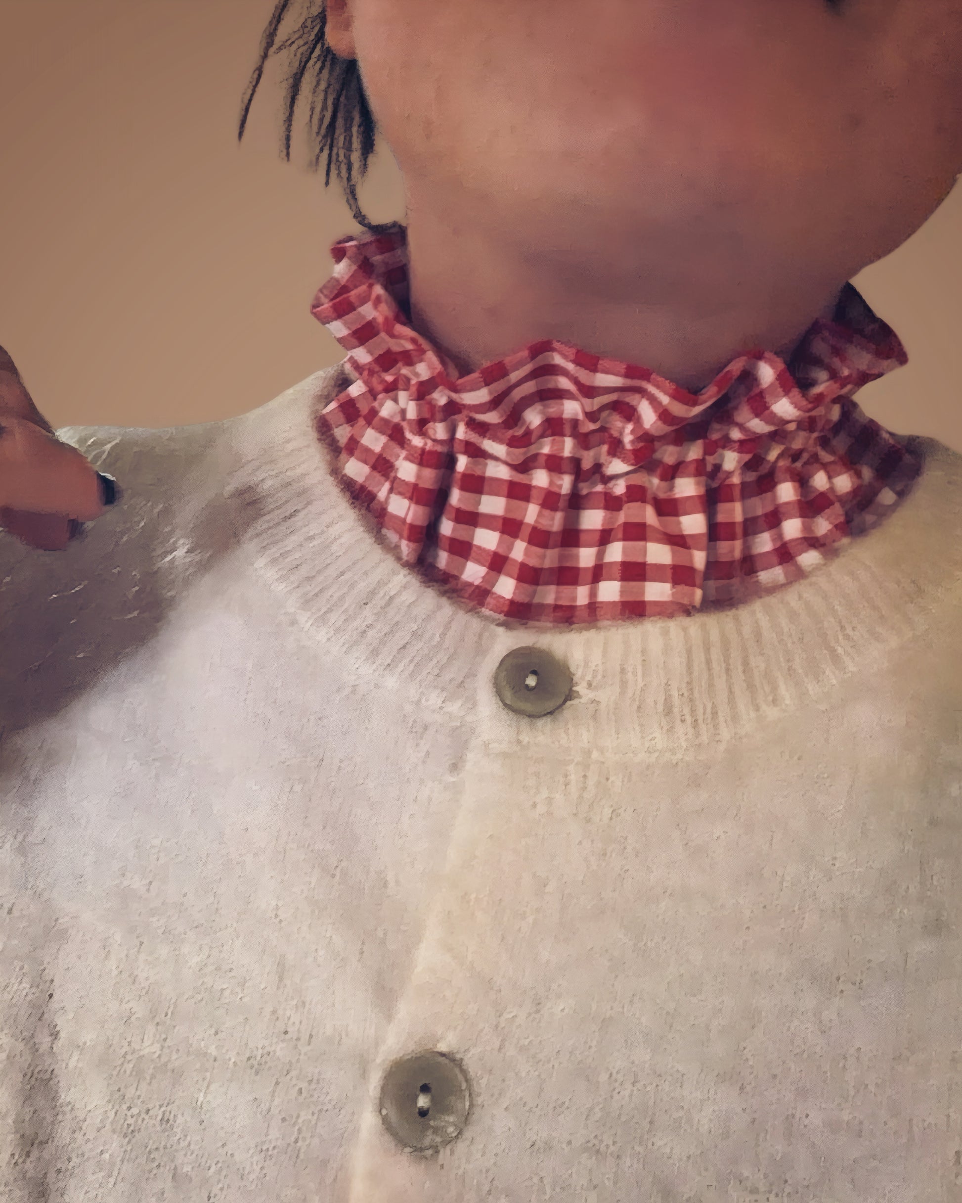 Col froufrou à carreaux, délicatement froncé, qui apporte une touche rétro et poétique à la tenue. Son tissu léger contraste avec la maille douce du gilet pour un jeu de matières raffiné. Ce col montant encadre joliment le cou et ajoute du caractère tout en restant féminin et confortable.