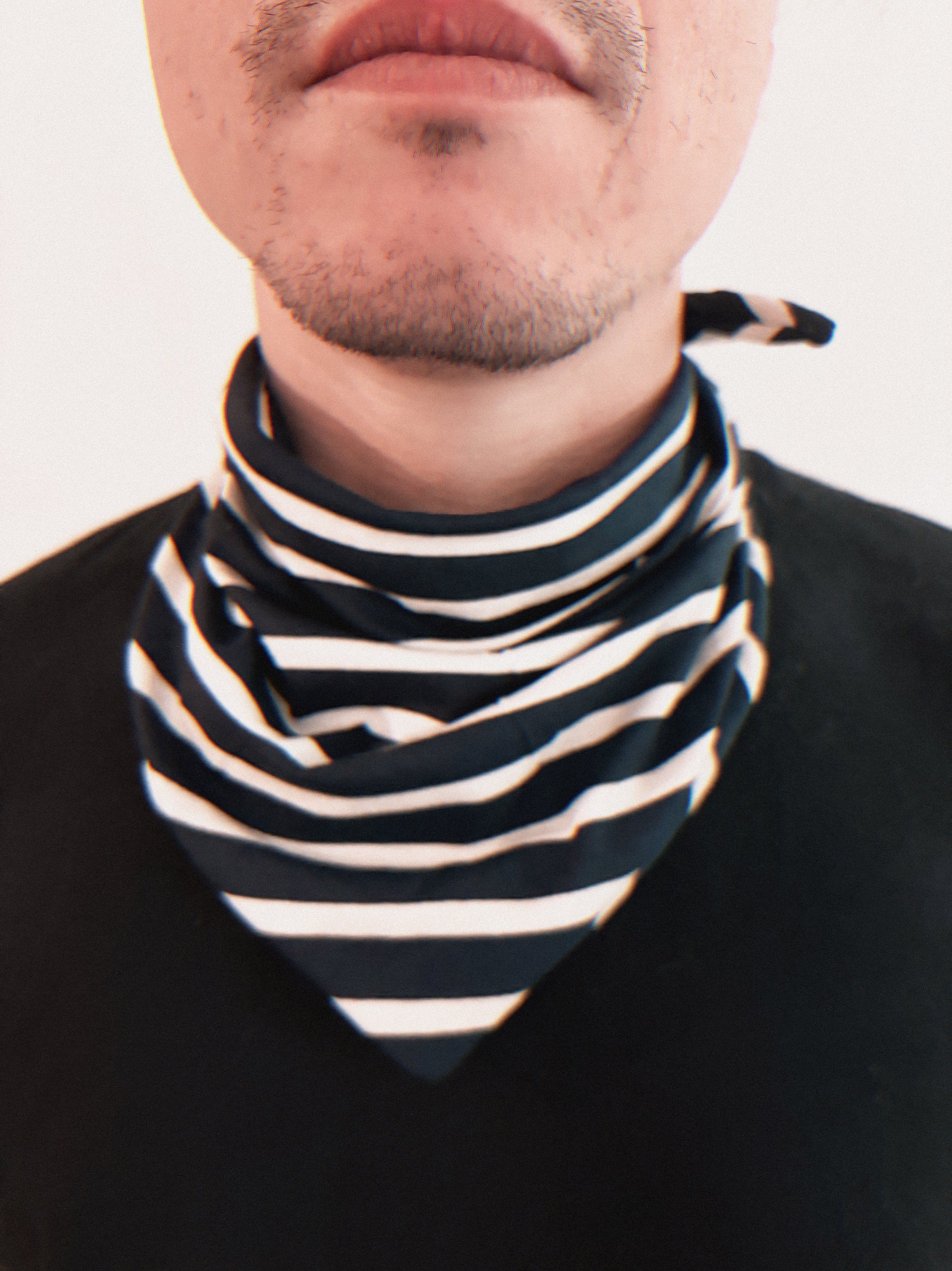 Ce foulard est confectionné dans un coton léger et souple, offrant un porté fluide et un confort optimal au quotidien. Son motif à rayures bleu marine et écru apporte une touche sobre et intemporelle, facile à associer à toutes les tenues.