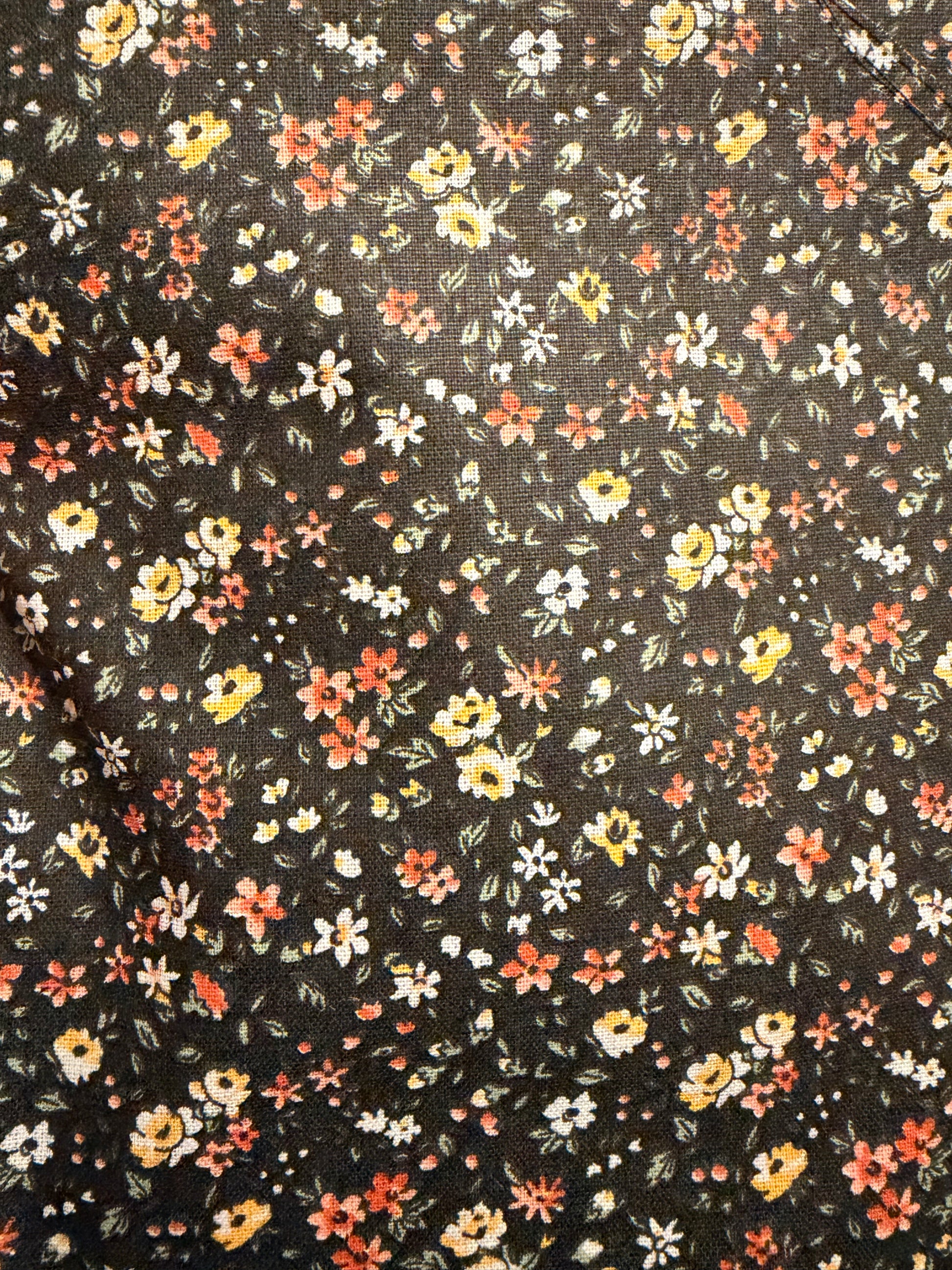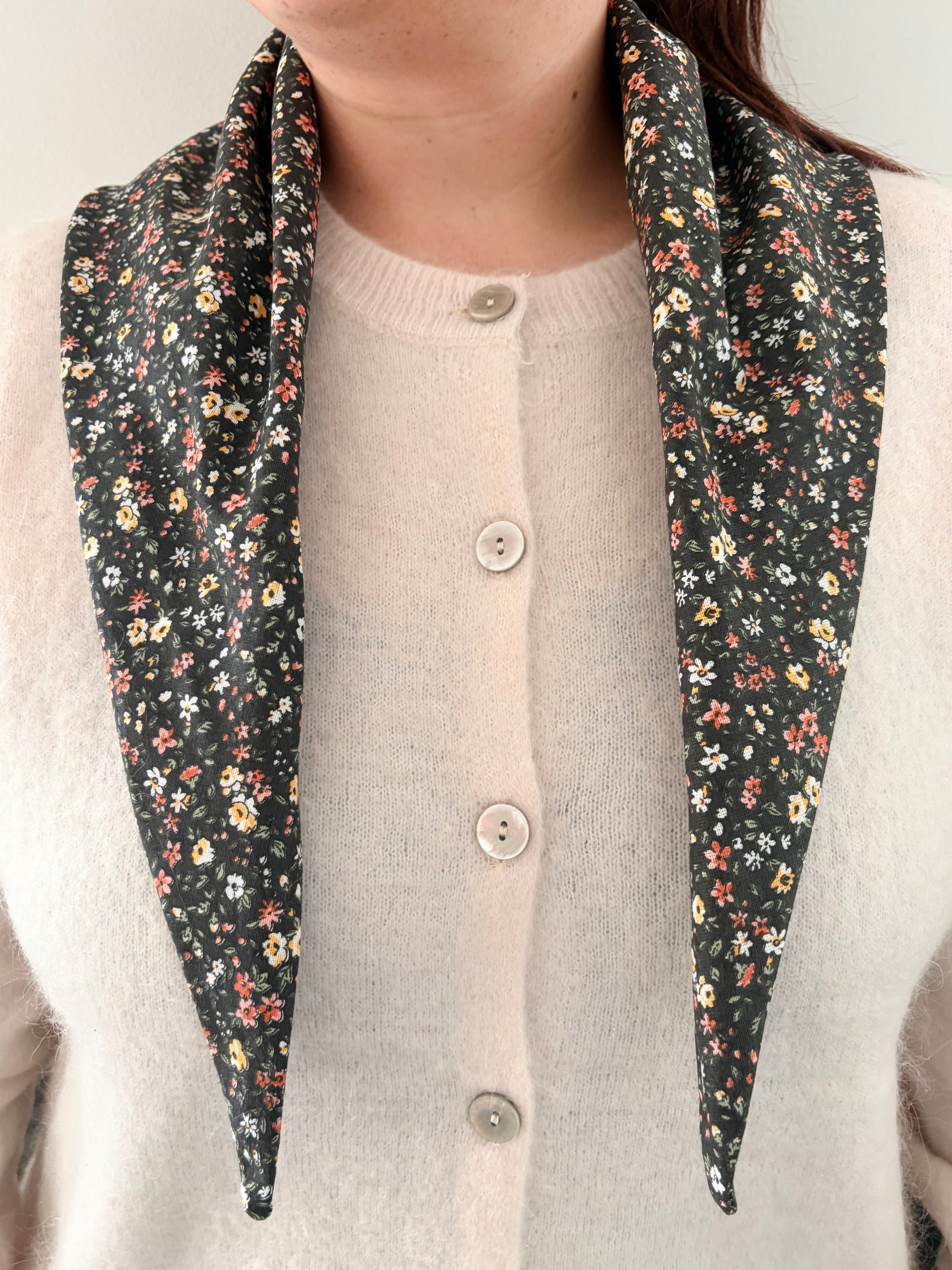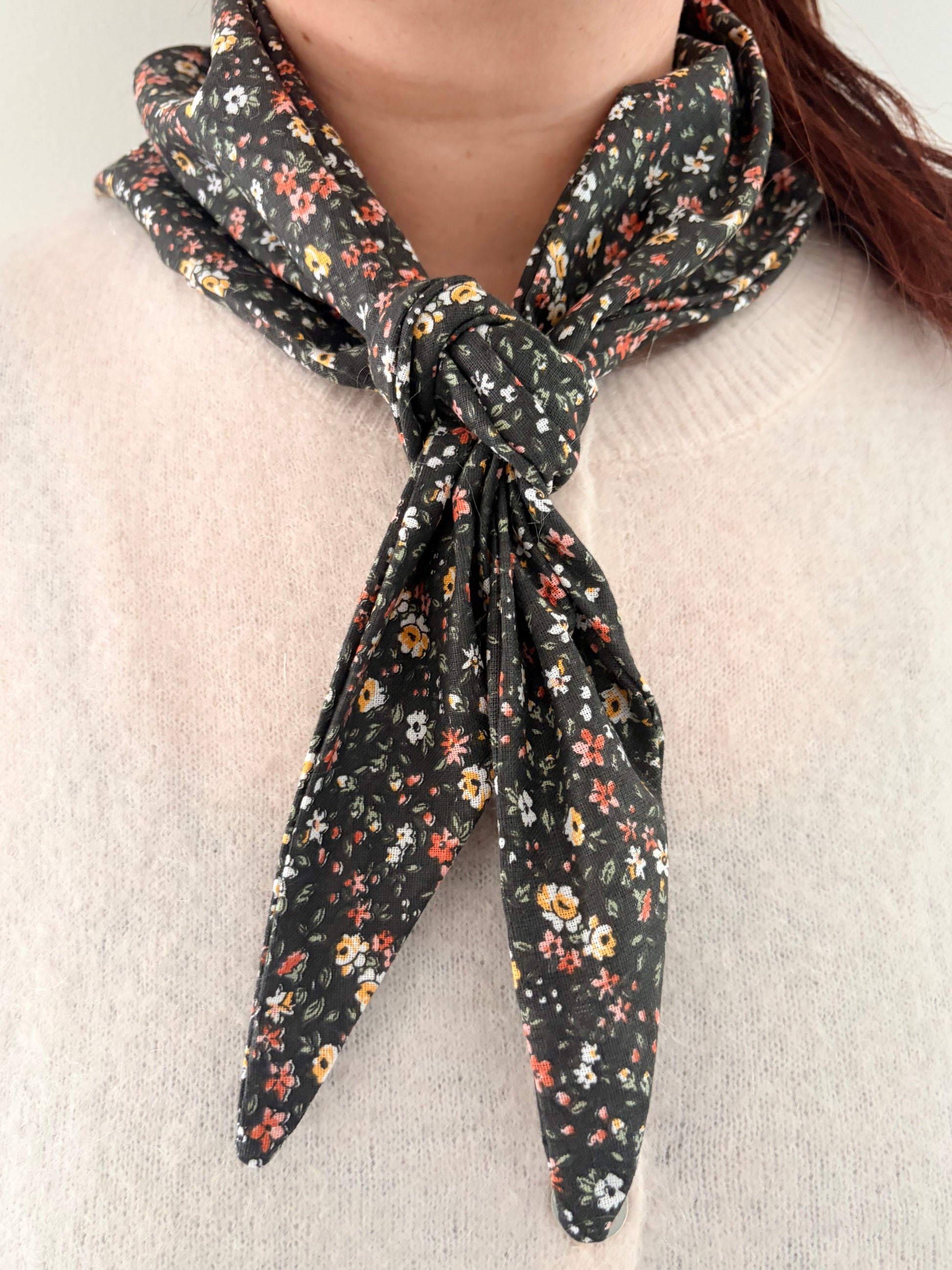 Ce foulard est confectionné dans un coton doux et agréable, idéal pour un porté confortable au quotidien. Son motif fleuri délicat, aux touches écru, moutarde et terracotta sur fond noir, apporte une élégance discrète et intemporelle.